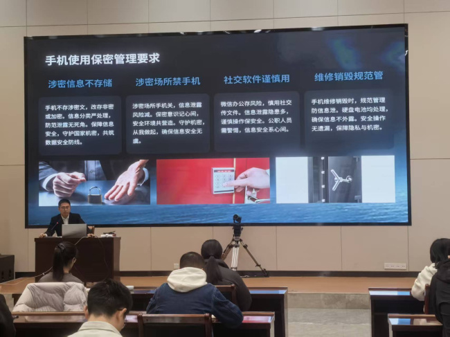 首先,参训人员集中观看了保密教育视频。视频选取了部分年轻干部和厅局级干部的典型泄密案例,真实反映了泄密行为对国家整体安全、个人职业发展造成的严重危害。视频学习后,办公室负责保密工作的刘鹏程同志围绕日常工作过程中的泄密隐患、保密工作相关法律法规、涉密案例分析、日常办公保密注意事项等内容进行解读,并结合法院工作实际明确日常工作中的重点注意事项,帮助干警找准工作边界、掌握防范技巧。为检验培训学习成效、巩固学习成果,培训最后还开展了知识测试。