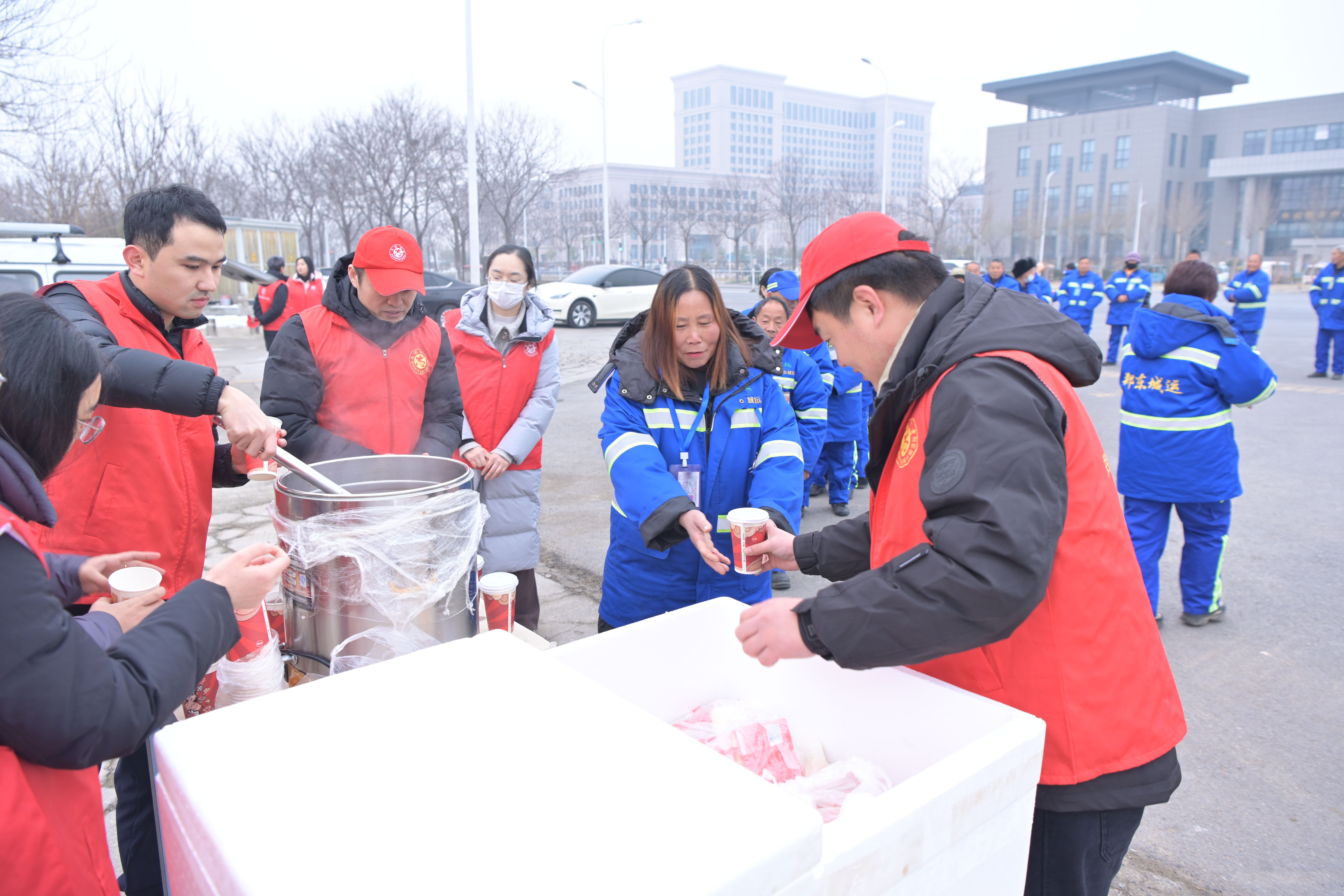 2026年腊八节到来之际,郑铁中院携手豫兴路办事处开展"关爱环卫工人·送温暖"活动。清晨,郑铁中院十余名干警将刚刚熬好的腊八粥和菜品分装到保温桶中,驱车来到通惠路环卫工人服务站,为在寒冷的冬日里辛勤劳动的环卫工人送上一份热乎乎的早餐。